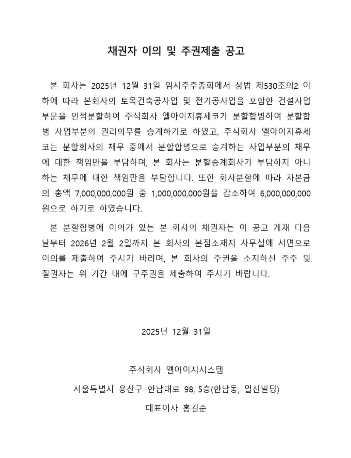 채권자 이의 및 주권제출 공고
